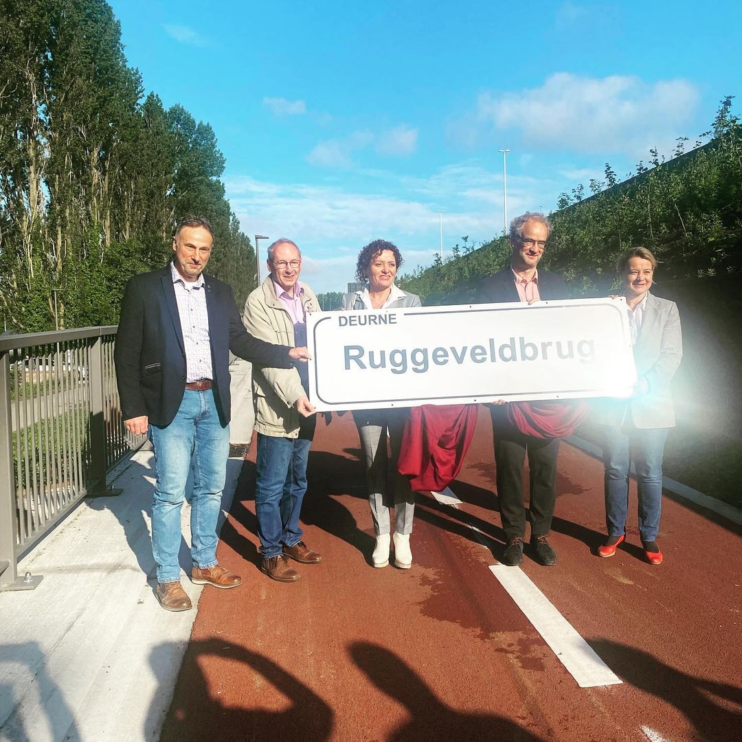 Vlaams minister voor Mobiliteit en Openbare Werken Lydia Peeters onthulde samen met districtsburgemeester Tjerk Sekeris, districtsschepen Freddy Lorent, districtsschepen Philip Van Acker en Antwerps schepen Erica Caluwaerts het naambord van de ‘Ruggeveldbrug’, de officiële naam van de brug.